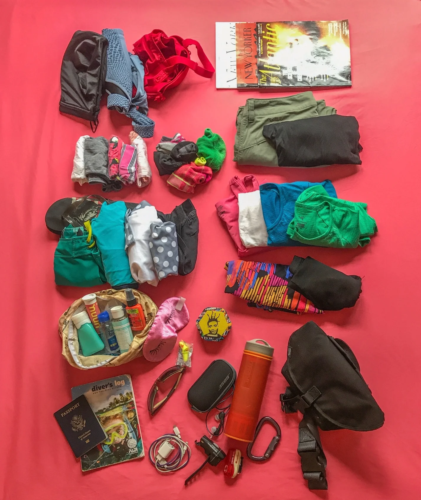 When packing for a trip, lay belongings out on your bed or floor, organized by category (day clothes, toiletries, underwear) or activity (diving, beach, biking 🚵). Don't forget reading 📖 material, headphones 🎧, phone chargers, and your passport! I'm a light sleeper so I always bring earplugs and an eye mask.